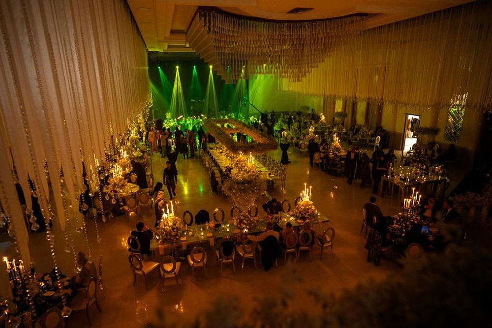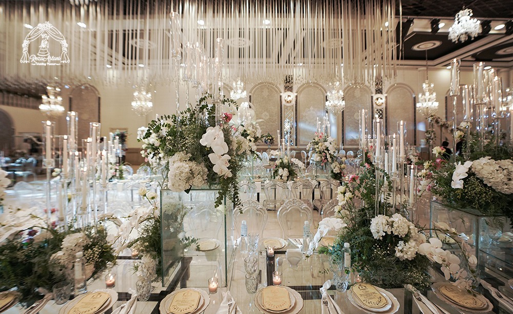 نورپردازی و شمع: نورپردازی گرم و ملایم با استفاده از لوسترهای کریستالی و شمعدانهای بلند و کلاسیک، به خصوص شمعدانهای برنزی یا طلایی، فضایی رمانتیک و مجلل ایجاد میکند. شمعهای مخروطی بلند روی میزها به جنبه کلاسیک مراسم میافزاید.