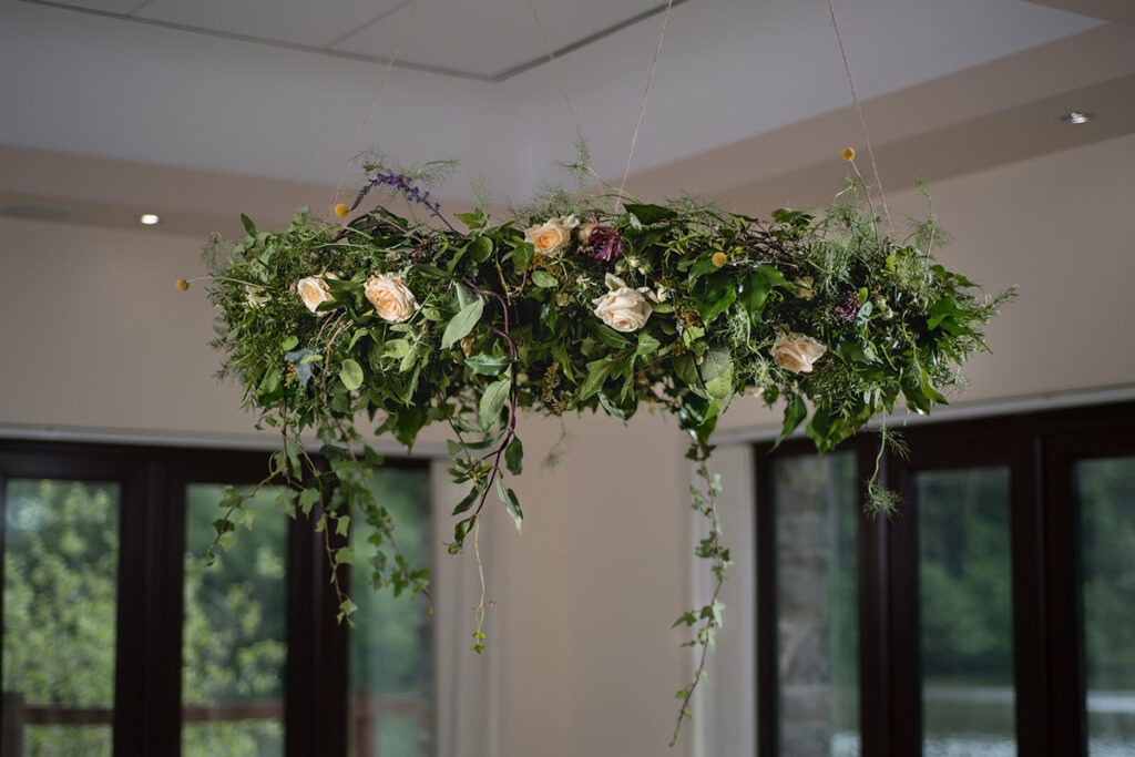 یک روش منحصر به فرد دیگر برای رونمایی از آرایش گل در عروسی از طریق یک ساختار پیچیده است. آرایشهای میز سنتی را با میلههای طلایی معلق، پوشیده از سبزه و نقطه چین شده با گلها جایگزین کنید که تضمین شده است مکان شما را به یک باغ افسانهای تبدیل کند. سپس، لوسترهای کوچک و شمعها را در کرات شیشهای از ميله ها آویزان کنید.
