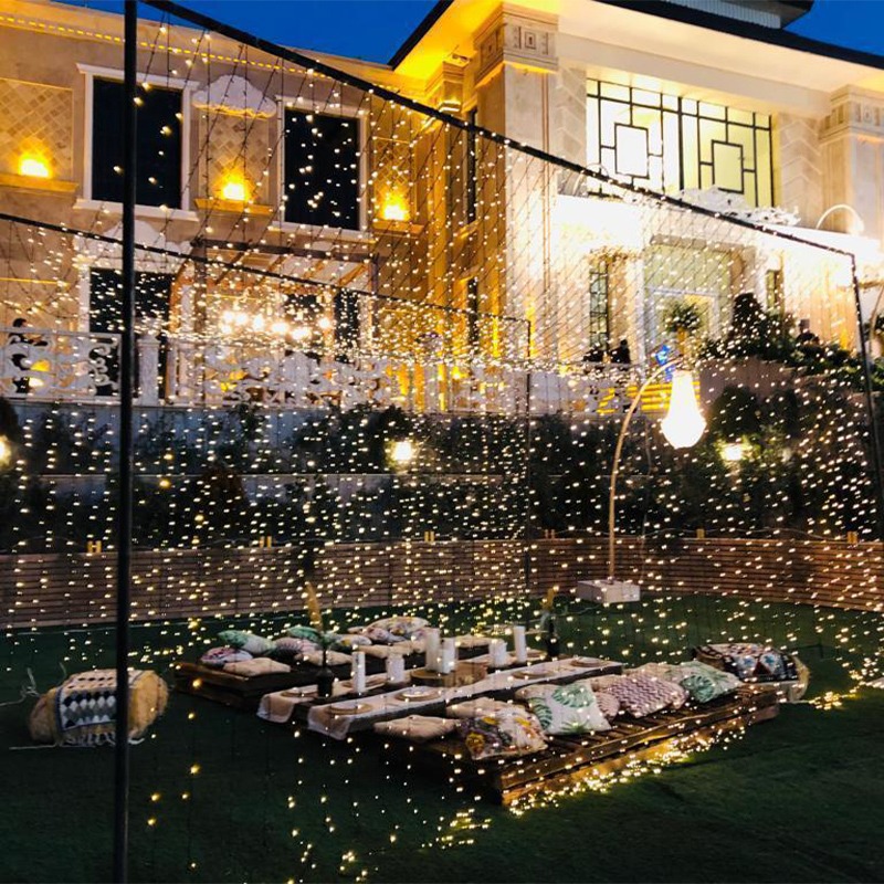 این ریسههای نور میتوانند از سقف یا سازههای بالای میز آویزان شوند و با شاخههای سبز در هم تنیده شوند تا یک سقف نورانی و سرسبز بالای سر مهمانان ایجاد کنند. این دکوراسیون برای مراسمهای عروسی در فضای باز باغ تالار یا حتی داخل سالنهایی با سقف بلند، جلوهای بینظیر و رویایی به وجود میآورد.در این زمینه میتوانید از تشریفات عروسی خود بخواهید که با توجه به مکان برگزاری بهترین گزینه را برای شما انتخاب کند.