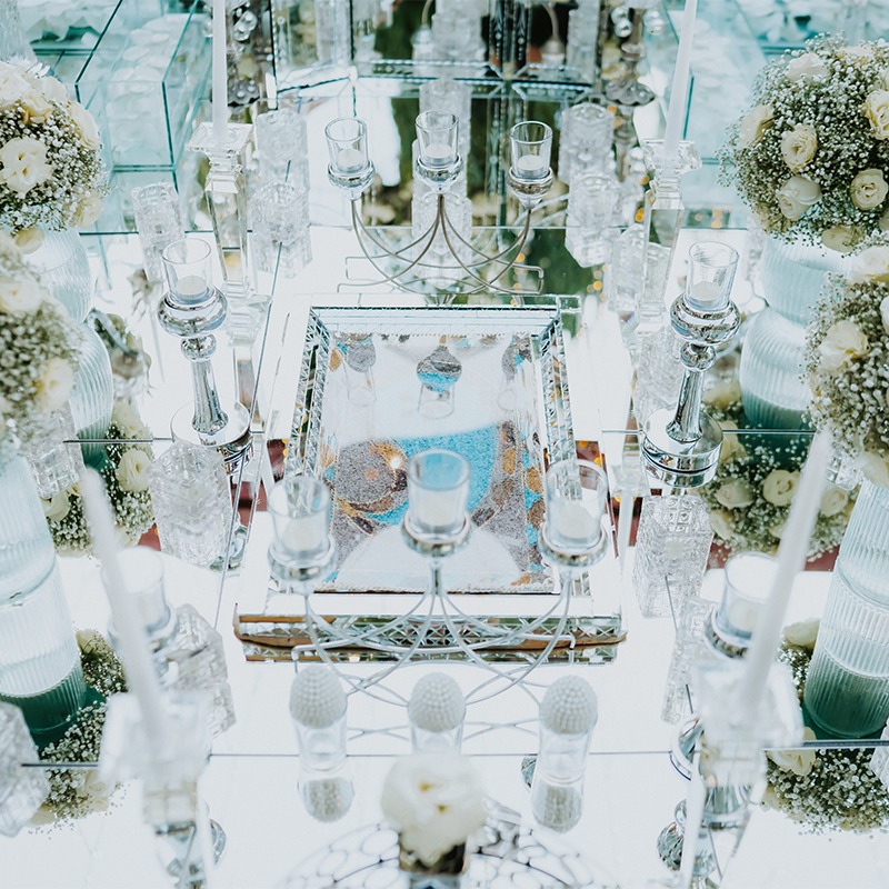 رشتههای نور و آویزهای شفاف آويزان از سقف در تركيب با لايههاى پارچه هاى آويزان توهم یک آسمان شب پرستاره را ایجاد میکنند و باعث میشوند فضای پذیرایی مانند یک مهمانی شام جادویی در فضای باز احساس شود.