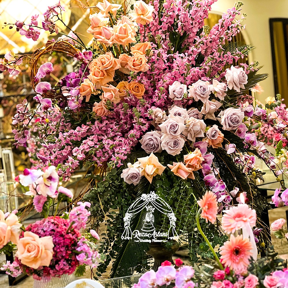 دکور: استفاده از یک نوع گل خاص، مانند ارکیده، در تمام بخشهای باغ تالار – از دسته گل عروس تا مرکز میزها – برای ایجاد یک امضای بصری قوی.